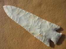 Collectible Hardin point. Featured in 2012 Flintknapping Calendar, month of May. This nice Hardin is cream with a hint of tan and made from Burlington. It was knapped by Marty Rueter, one of the best Abo knappers around. Knapped June, 2004. |