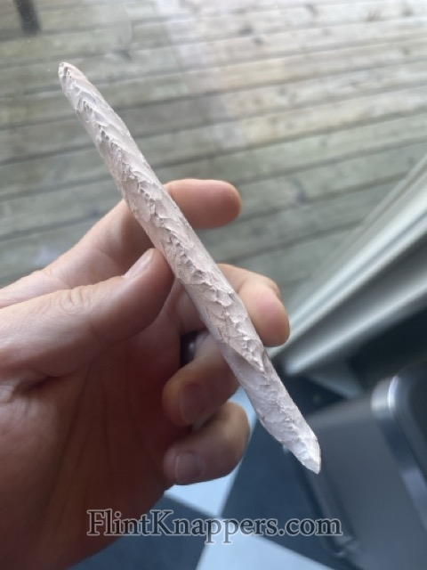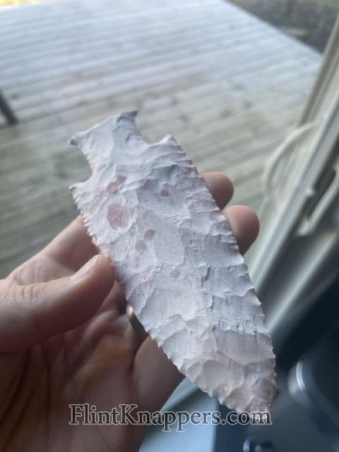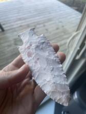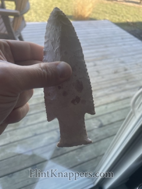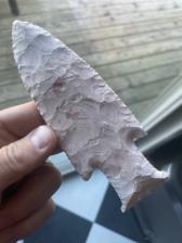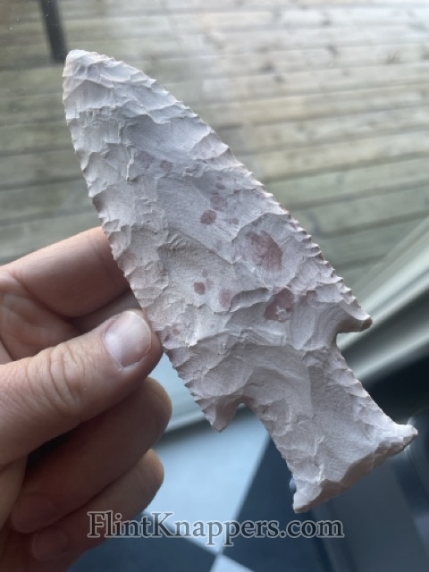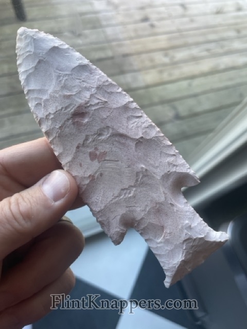 A beautiful Burlington Hardin arrowhead. This point is made using heat-treated Burlington chert. Great percussion work with pressure flaking along the edges. Some neat pink polka dots on both faces of the blade.