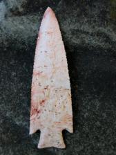 This is a super Hardin point. It's made from a very colorful piece of Burlington Chert with red inclusions. This point is appropriately thin and properly beveled like the ancient ones. The base has been ground & polished. |