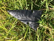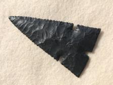Nice flaking on this serrated, extra-large, Harrell-like point, made from beautiful black Dacite from Oregon. Knapped by skilled, veteran flint knapper, Craig Winter. Knapped Feb, 2000. |