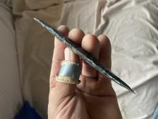Dacite w a slight green backlit edge. Wood shaft punch over hammerstone. Very little horn pressure |