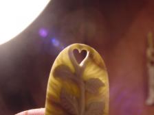 Here is another beautidul carving from African butterstone, I love this material, I got it from eric's rocks about 10 years ago! never really cut it up and played with it till recently and I kick myself but on the other hand it would not be in my hands today ! This one is a heart growing as love should do, this one is filled with love as there are actually 3 hearts, 2 are obvious but the 3rd is hidden. This year I dedicate to love as ever carving that I do this year will have a tiny heart's carved somewhere, some plain in view and others hidden very well, it will be kinda fun to find them , and document "love" ~ Signed bonecarver and numbered. |