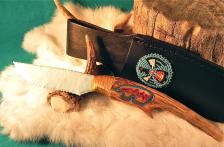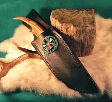 Turquoise blue runs throughout this knife & sheath combo. A nice gift idea for that “hard-to-buy-for” person! The knife is 11 ½” long & is comprised of an antique carrara glass blade & a mule deer antler tine handle. The blade is light blue & knapped & shaped very nicely. I carved a Southwestern Indian “bear” motif with a “heartline” (representing the path of breath thru the bear giving life & strength to it’s body, soul & spirit). All is tightly secured & finished off to a satin luster – and fits comfortably in the hand. The belt sheath is black leather & sports a matching blue “Thunderbird.” Awesome combo! (please include $8.00 for shipping & insurance). Thanx for looking! **NOTICE: WHILE SHARP & BUILT TO LAST….MY CREATIONS ARE FOR COLLECTING PURPOSES & NOT FOR HARD USE! |