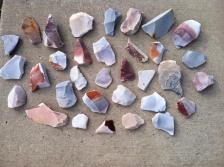 Very popular and easy to work, heat treated Novaculite, from Arkansas. Quarried, spalled, and heat treated by the Novaculite experts – Bob Thomas and Tom Popow. Colors – creams, pinks, grays, oranges, purples, and polk-a-dot. 30 pieces, ranging in size from approx 7 x 3 to 3 x 3 inches, with avg 5 x 3 to 4 x 3 inches. $50 (20 lbs at $2.50/lb) + $12 shipping (medium flat rate box). |