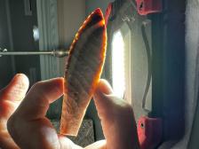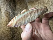 Made from beautiful Coastal Plains chert from Brier Creek, very colorful! Made to resemble a Hell Gap point found in Wyoming. Serrated sharp, hafting area is ground. Thanks for looking! |
