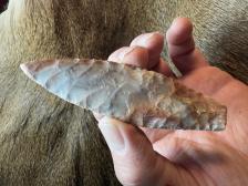 Beautiful colors in this Hell Gap point made from Burlington chert. Base has tiny crystal seams. Hafting area is ground, serrated sharp, thanks for looking! |