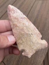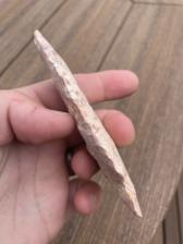 A super colorful Hemphill blade. This thing has pink, red, yellow, orange throughout the stone! Very unique piece of Burlington chert.