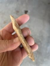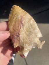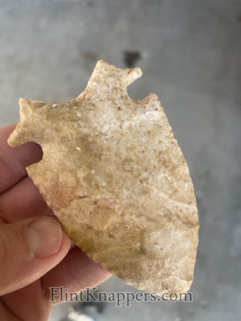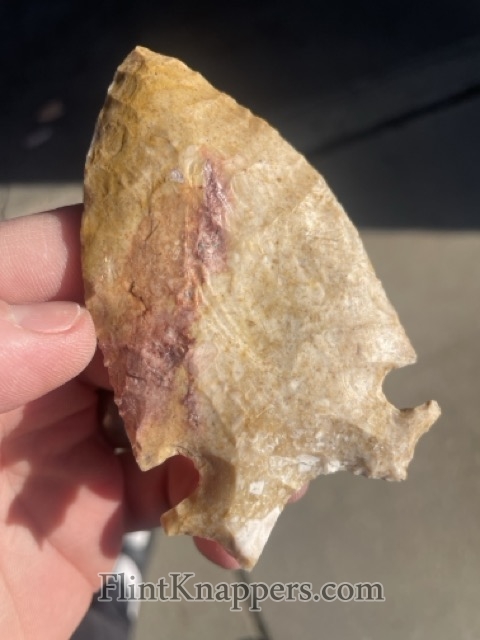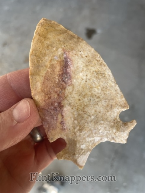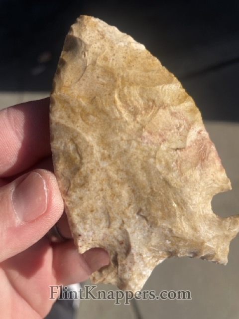 A high grade, waxy Burlington Eccentric point. Percussion knapped from Burlington biface. This point has oranges, yellows, and pinks. Rice grain fossils throughout.