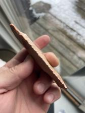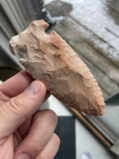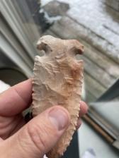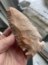 A nice Hemphill blade. Really nice circle notches. A well-balanced point. Heat-treated Burlington chert.