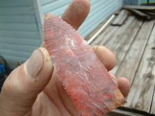 Hi ! Well,,I made this pt.,but it has a small problem,a small piece of a flake would not release on a crystal area ( typical),in the upper middle part of pt., in the clear spot.It's small,but a bit ugly,a few rough scar flakes also.It is also very beautiful,thin mostly good pt.,and sharp/useable.So,if someone would want it,please send me an offer,K,....It is appx 3 11/16 x 1 1/8 wide,thanx kindly ! |