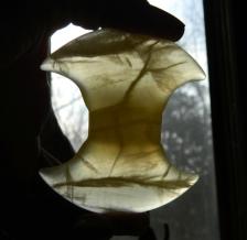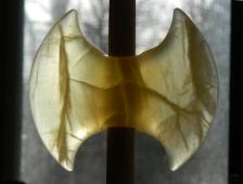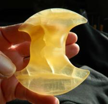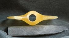 This is a pretty nice notched ovate bannerstone made from Honeycomb Calcite. A pretty scary piece to work on. This is the second banner I've made from this stone. The stone is nothing but cracks, lightning bolts and ripples. It is scarey to work with, but it came out OK. The surface is as smooth as glass. It's solid, it survived the process, but makes me a little nervous just to handle it.