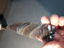 This is one HOT COLOR blade!!! The blues and purples really come to light here. The prescision flaking lights up the surface of the blade while the edges are super sharp because I use a unique technique that I'm not talking about. 6 3/8 inches long by 1 3/4 wide at the hafting end but can be narrowed to fit a different handle. Ready to go in to the handle of your choice.
