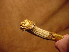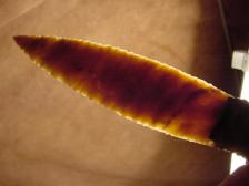 Offered here is a Beautiful Eagle totem Chief spirit knife carved from a fallow deer antler, I incorporated the crown of the antler with the head dress of the Indian and the eagle feathers flowing back on the handle towards the blade, on the brow tine I carved a small eagle head in 3-d , the blade for this knife was knapped by Jim Conacher from a very nice piece of translucent flint ridge, the spirits dance inside the blade. A very nice knife that fits nice in either hand. the handle is signed b0onecarver and the blade was signed by Jim. |