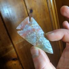 A thin, well made point with great oblique flaking. Made from a highly tranclucent piece of Indian Jasper