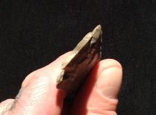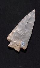 Green Indiana Hornstone Fractured Base Decatur chipped with antler and bone. Blade is beveled,has nice percussion scars and a Fractured Base. Base and notches are lightly ground.