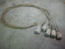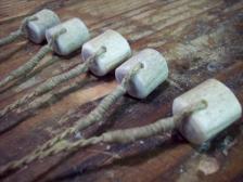 essentially a weighted net, this weapon has been used by peoples of the far north for thousands of years to catch geese and other fowl in flight. hand twisted flax cordage and caribou antler weights. simple as it is effective. |