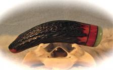 Check this one out! As is usual with my work, you get classy & rustic mixed together. This piece of choice Elk stag has been sent away for color treatment & stabilization. The “amber stag” treatment goes to the core & creates a 4-tone sunburst effect (black, red, orange & then yellow) as the surface is worked. It reminds me of a very old, worn-in piece of stag or even a fossilized dinosaur bone. It’s knobby & has great purchase. It’s capped off with a section of antique red-swirl bakelite, & a piece of jade-green agate stone. I’ve pre-slotted it for your blade. It’s 5” long. (I will need an additional $5.00 for shipping & insurance). Save that special blade you have set aside for this one!! |