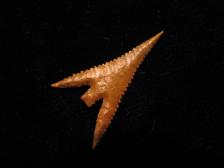 This Gunther Barbed point is made out of a piece of jasper that is a yellowish tan in color while greenish on the outside. Most of the green is gone now. Thin tipped, long barbs, and fine serrations and flaking like the old ones were. |