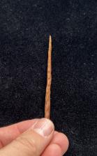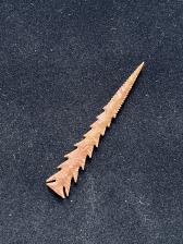 This point is styled after point found at the snaketown site in AZ. This one is made from an unnamed jasper or chert from Wyoming. The color orange/brown. The point is long and narrow with good symmetry. |