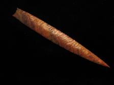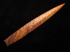 This jasper Humbolt point is made out of a beautiful piece of banded jasper with darker streaks running through it. I'm not sure where the jasper is from but it could be a darker version of Oregon sunset jasper. The diagonal flaking turned out so nice on this that I just made it into an extra long and sleek Humbolt point and left it as such. |
