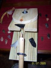 THIS IS A JIG THAT MAKES IT EASY TO KNAPP, AND DO FINE DETAIL WORK. THE ALSO INCLUDES THE FLAKER WITH THE JIG. I ALSO HAVE VIDEOS OF THIS JIG IN ACTION ON YOUTUBE IF YOU WOULD LIKE TO WATCH.JUST GO TO YOUTUBE AND SEARCH JAMES TUBBS KNAPPING JIGS.