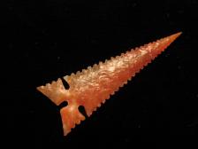 This serrated Cahokia point is make out of a piece of what I am sure is Keokuk chert I found squirreled away in my material and given to me a number of years ago by T.J. Onkin. (RIP Tom). Its what a lot of the original Cahokia points were made of I was told. While a pretty translucent reddish orange, this material was replete with little crystal pockets and other small annoying surprises. Despite all that I managed to coax this nice point out of it. |