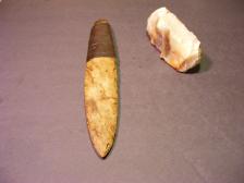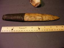 Here is a nice Dagger I percussion knapped from Keokuk chert, the blade came out nice,,, it has an aged appearance with a leather wrap around the handle area........ It measures 10 1/2" long......Priority Shipping and insurance included in the price |