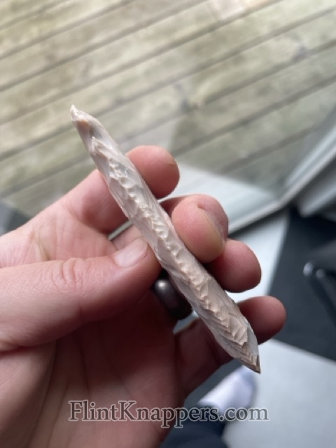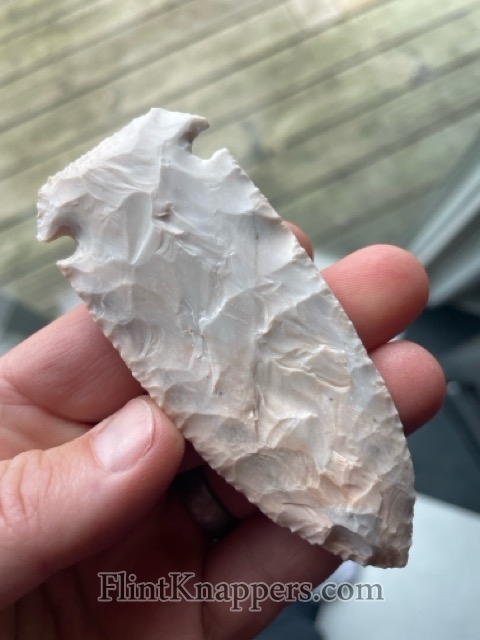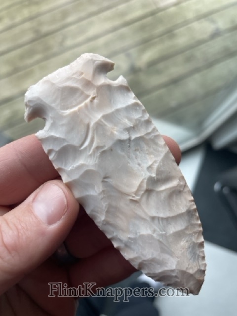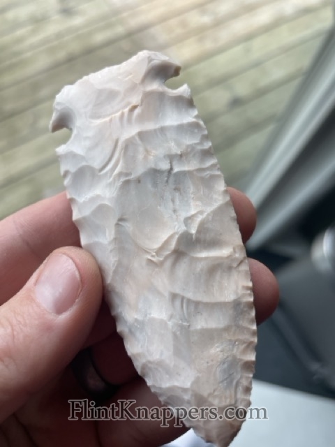 A large Kirk-Corner Notch blade. Really nice flaking pattern (this variety of Burlington can be finicky.