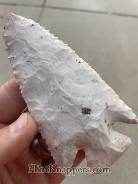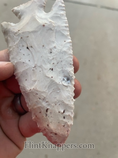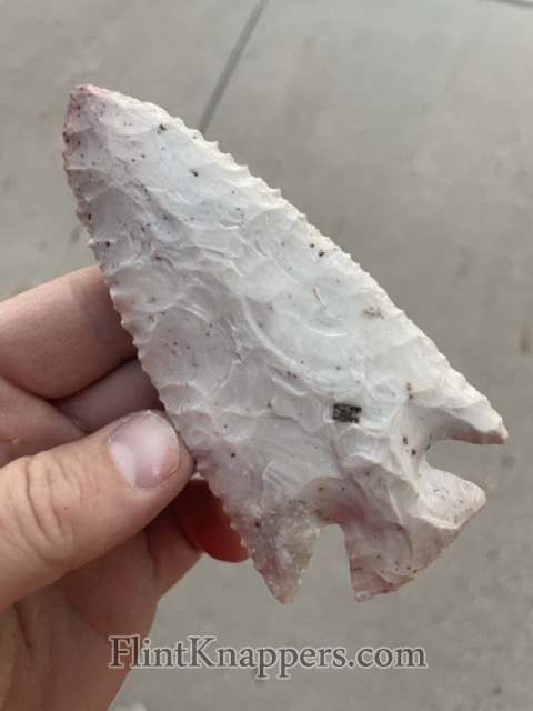 A very symmetrical and thin Kirk Corner Notch blade. Made with a very nice fossiliferious Burlington Chert. One crystal inclusion at the top and one near bottom.