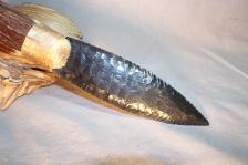 This nice knife is 9 3/4 inches long and this nice blade has been knapped out of a dacite. Some would say a low grade of obsidian. It is completely opaque, letting in no light. This handle is an Elk Antler with a Walnut End Cap.