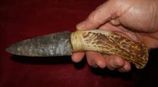 Well made knife out of Onondaga chert from Ontario, Canada with a whitetail antler handle. Hafting material is pine pitch and buckskin rawhide. |