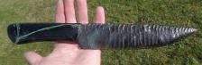 Over a foot long total length (12 ¼”), the blade is exceptional rainbow obsidian with bands of color throughout its length in bright light. The handle is a very dark green to black marble with light green streaks and a fleck of gray or two. The green streaks are remarkably symmetrical on both sides of the handle. I’m not a geologist, but I do know this stone was a LOT tougher to work than most other marble that I’ve worked- to the point that if a geologist says its kryptonite, I’d be inclined to believe it. Superman aside, it does make a nice handle. The blade is 7.25’ on the top. Price includes US shipping. |