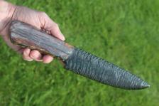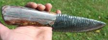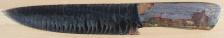 The handle is made from a busy piece of Picasso Marble, with reds, browns, grays, white and tan present. The rainbow obsidian blade in bright light shows some green and a horizontal band of pink that goes well with the red in the marble. Price includes shipping in US. |