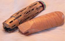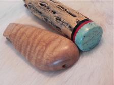 Here are 2 nice handles for your knife-making projects. Put those knife blades that you’ve socked away, into some great grips & finally get them done! The smaller grip here is highly curly maple wood. It’s already slotted for a blade & drilled for a lanyard strap. The other is Arizona cholla cactus & is mated with spacers & a nice turquoise butt cap. It is also pre-slotted for a blade, so all the work is done. Both have my process of sanding, buffing, finishing, & polishing to make the grain “pop” & bring them to a high sheen. Notice the attention to detail & close tolerances. I also use the best 24-hour epoxy that they make IMHO. (4” & 4 1/2” long). $7.00 shipping & insurance on these. |