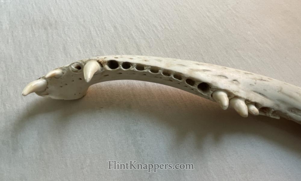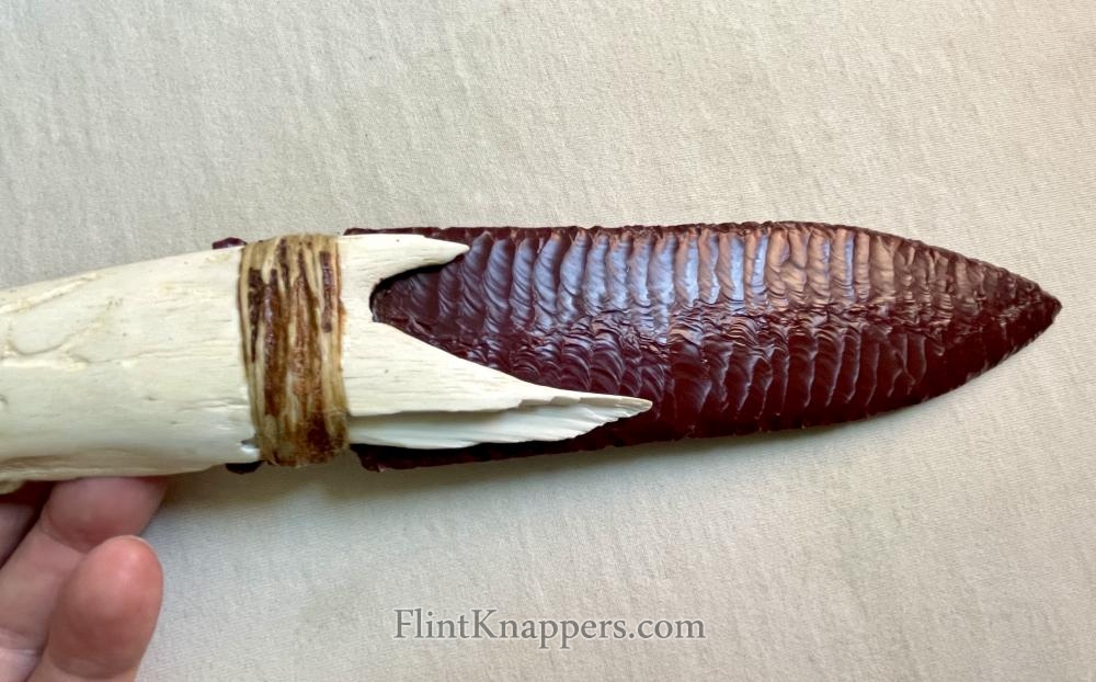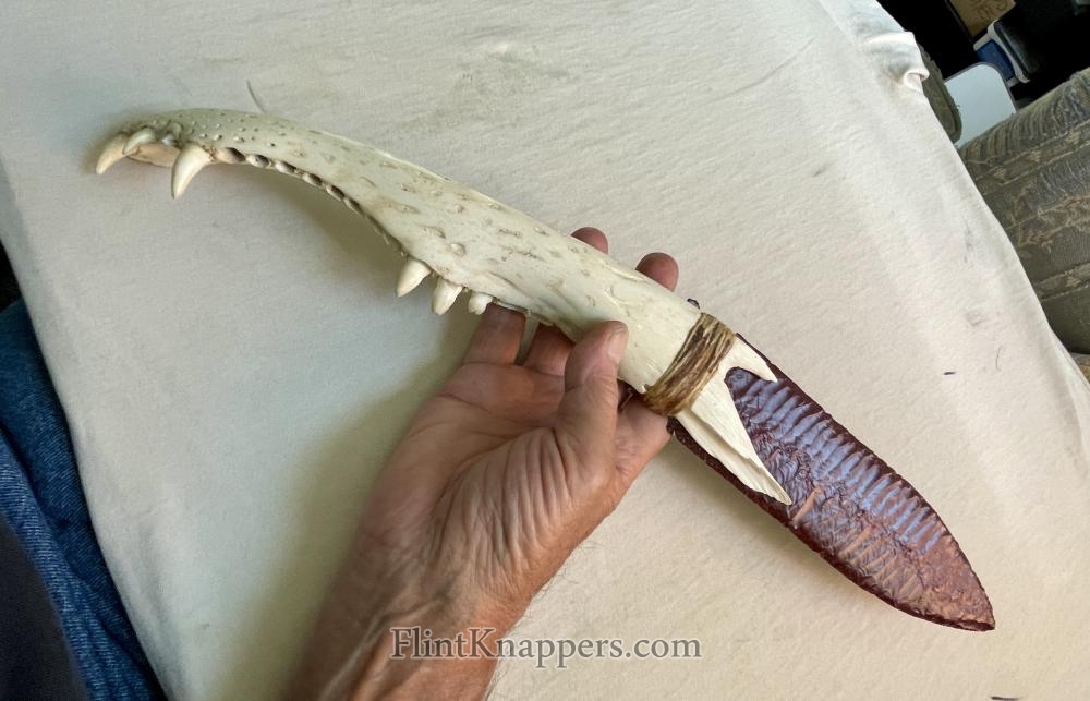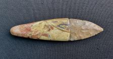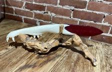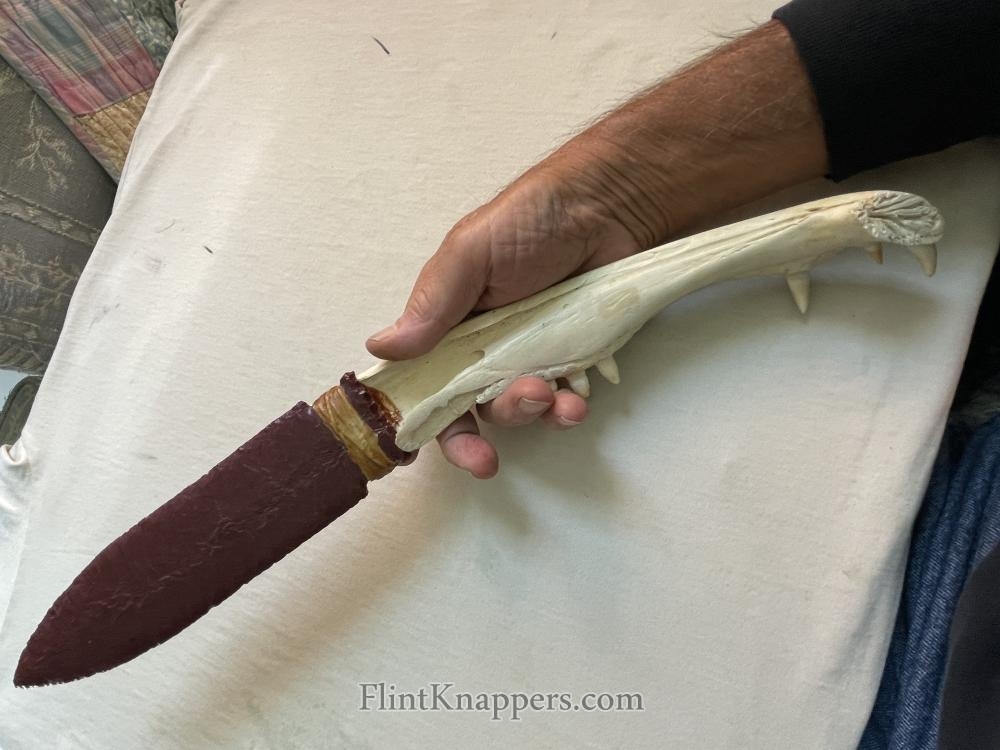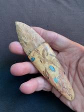 This little piece has a 2-1/2” Flint River blade hafted to a stabilized spalted maple handle. It has a few small inlays of turquoise and is 5-1/2” inches long. Signed and dated. |