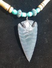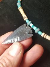 This Lassen blue obsidian was dug up over 25 years ago and its next to impossible to find this high quality of color anymore. Fortunately a friend offered me some in a material trade and I've been searching for more of it ever since. Unlike most obsidians from the U.S. the color is solid in this material and doesn't require sunlight to show off its colors. Thanks for viewing. The edges are lightly ground smooth after it was flaked. The long beads are made from buffalo bone. |