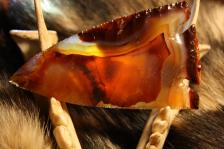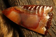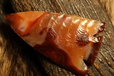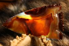 Stunning, absolutely stunning. This is a large point knapped from some of the most outrageously colored Piranha Agate one could hope for. The colors remind me of northwestern sunsets accented by volcanic eruptions. It would be hard to imagine better colors and patterns. The point has great mass, beautiful flaking, and micro serrated edging. The notches are not that deep due to an old fracture which had not completely healed. My notch flakes stopped at the color ribbon so I did not push it in hopes of not blowing this piece up. Luckily it was solid enough to knap and it stayed together to create this piece of art. You could look a life time and not find such a piece of agate. |