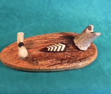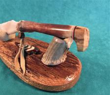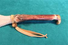 Natural & rustic is this knife & stand. White & lavender swirl antique glass, with nice knapping, forms the blade. I used a whitetail deer leg bone for the handle & “antiqued” it. (Notice that I reversed the bone, putting the “knuckle” at the front…huh?). The pommel has spacers & a figured maple butt cap. A soft leather lanyard with a tiny copper “buffalo Nickel” bead, rounds out the piece. I used wormy American chestnut wood for the stand, & boy is it wormy! I’ve onlaid a stylized bone arrowhead, & the props are deer antler. Very rustic! The knife is 8 ¾” long. (Please add $10.00 for shipping & insurance to anywhere in the U. S.). ***NOTICE: WHILE SHARP & BUILT TO LAST….MY CREATIONS ARE FOR COLLECTING PURPOSES & NOT FOR HARD USE! Thanx for looking! |