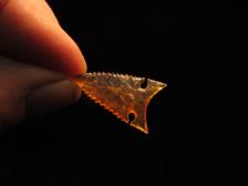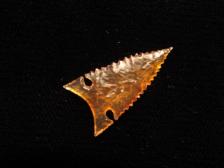 This little side notch is made from a piece of orange colored Montana agate. It sports delicate expanded key hole notches and fine serrations with a needle tip. This is a little point only about an inch but its a cutie. |