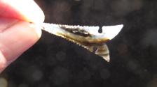 This little side notched SW style point is a variant of the type found in S AZ at Snaketown, and is a type of Hohokam point. It is made of clear and banded Montana agate with expanding notches and fine serrations. It's dainty but deadly |