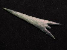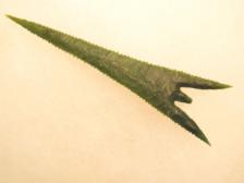 This extra long super skinny long barbed serrated Gunther is made from a beautiful green piece of eastern Oregon jasper. This one is way bigger and skinnier than the old ones, I was just sort of seeing how far I could 'push the envelope' on this pretty piece of rock and here's the result. Kind of hard to catch the true color of green on it but you get the idea. |
