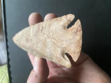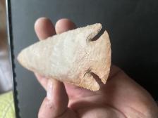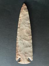 Heat treated buffalo river. Antler percussion and pressure with bevel. Copper notch. |