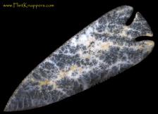 A gorgeous Lost Lake point made from Amethyst Sage Agate. The numerous black dendrites are sharply contrasted by the cream colored matrix. The stone work is superb. It is signed and dated by the artist. |