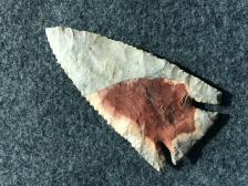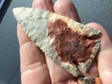 A nice Lost Lake out of beautiful Horse Creek chert. It was knapped by a young Charlie Hampton, at the time. Horse Creek chert is scarce and found in Tennessee. The color is gray, with a defined area of shades from dark red to light orange. Knapped April, 2002 |