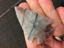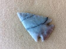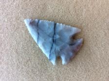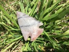 A nice Ed Moreland Lost Lake. It's made from Arkansas Novaculite. The color is gray with pink, and has nice diagonal black lines. Ed is an excellent flint knapper from Ohio. Knapped at the Georgia Knap-in, Apr 2002 |