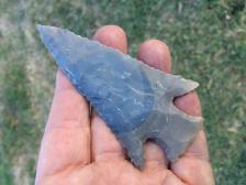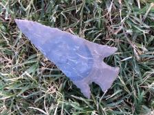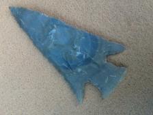 A really pretty Indiana Hornstone, beveled Lost Lake, by one of the greats, Marty Rueter. This one was made by Marty back in his early knapping days. It was purchased at the Arkansas Bull Shoals Knap-in. Marty is one of the best abo knappers around. The color is gray with a darker, bluish-gray bullseye. Knapped Oct, 1997. Inv # 9710-282R |
