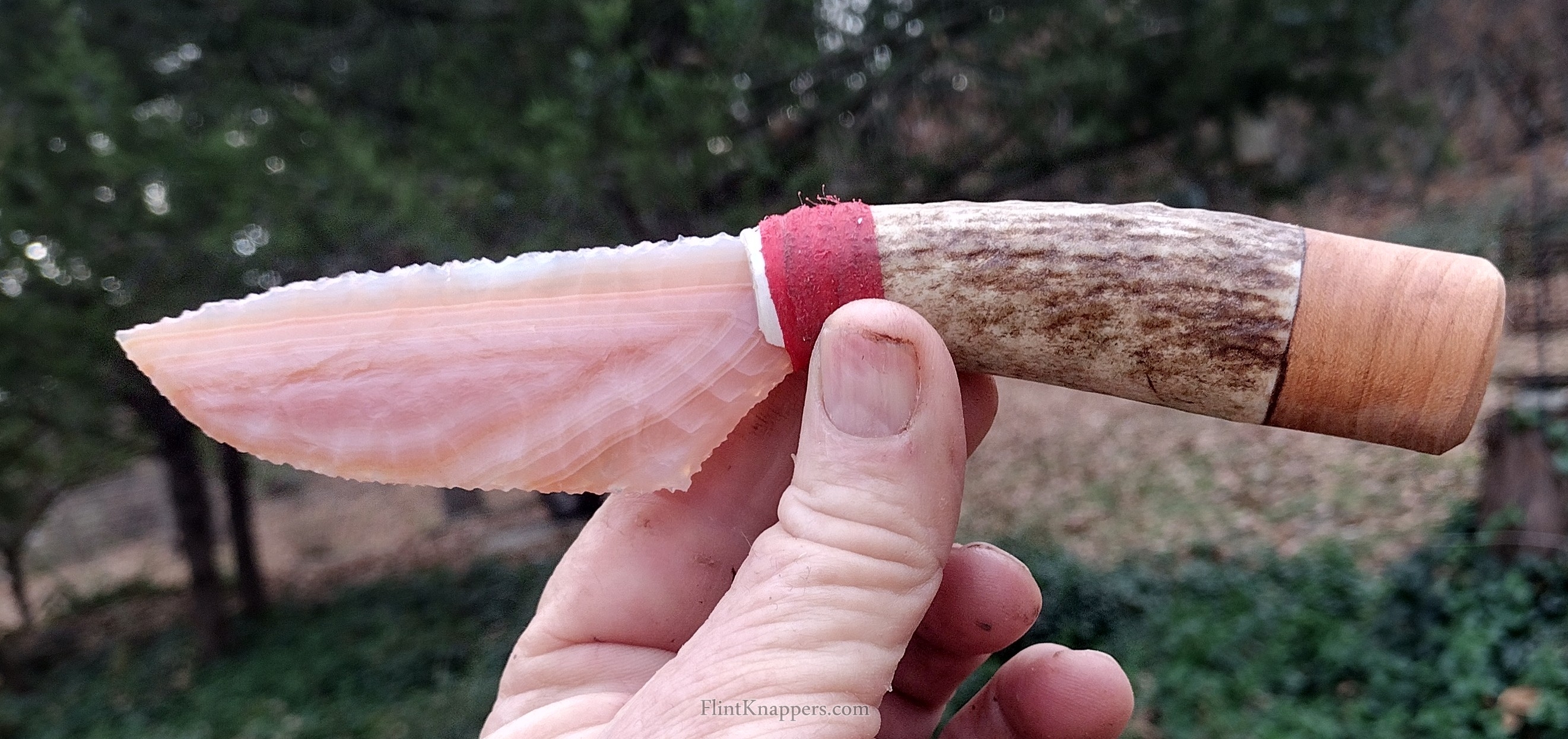 Mahogany obsidian blade with buffalo feather on deer jaw |
