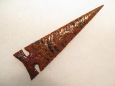 This nice Ishi point is made from a piece of mahogany obsidian from Glass Buttes OR. Has nice expanding notches and is more like the larger sized points that Ishi periodically made. |