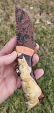 Silversheen Obsidian blade with Fordite cast in resin handle |