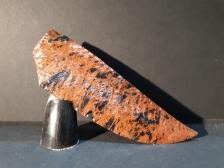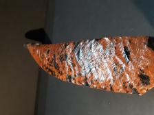 This is a SWEET WIDE BLADE done in a clip point. The red is bright and the blacks spots mottle the blade end to end. The flaking is prescision with extra sharp thin edges--no faking here. It is narrowed at the haft end for a good handle fit. 6 inches long by 1 7/8 inches wide and 1 1/8 at the hafting point.